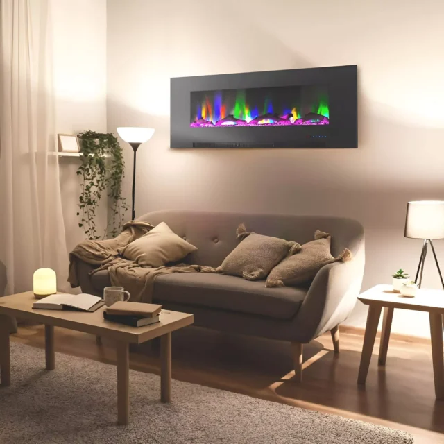 The 50-Inch Wall Mounted Electric Fireplace brings the beauty and comfort of a classic fireplace to any room, all without the hassle of wood, smoke, or venting. This electric fireplace is designed to turn your space into a cozy retreat, featuring vivid, realistic flames over a charming bed of driftwood logs. The striking LED flame effect offers ten adjustable color settings, allowing you to create an atmosphere that matches your mood—whether it’s a soft, romantic glow or a vibrant, colorful display that lights up the room.