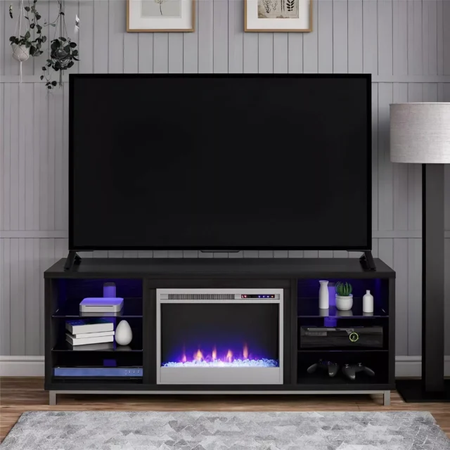 • Spacious & Stylish Storage: Two illuminated shelves on each side of the fireplace insert offer space for gaming consoles, media players, and more. The top surface comfortably supports up to a 70” TV (120 lbs. max weight).