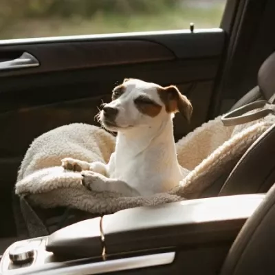 Our dog carrier adapts to any car seat with ease. It includes an adjustable strap for secure fastening and a long handle for additional stability on the headrest.