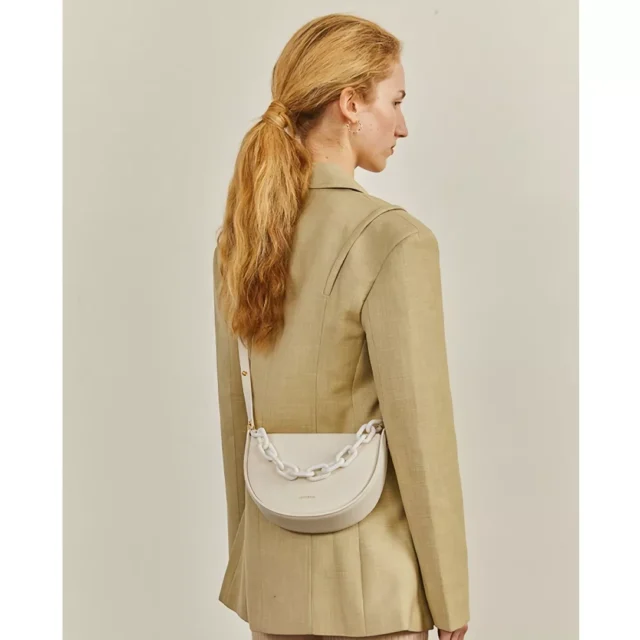 At the heart of its design is a commitment to both aesthetic appeal and practicality. Crafted with high-quality split leather and a durable polyester lining, this purse stands out not just for its beauty but also for its resilience. The unique semi-circle shape, complemented by a chic resin chain decoration, offers a nod to nostalgic elegance while keeping your look modern and fresh.