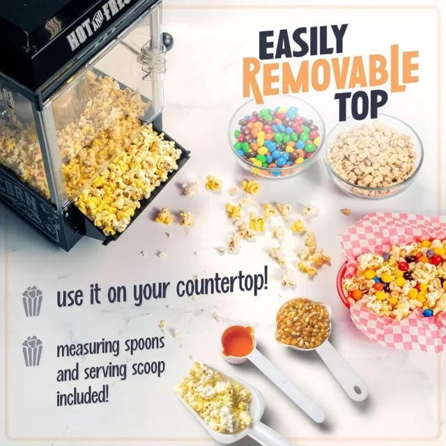 • Pops up to 10 cups of popcorn per batch, perfect for large gatherings.